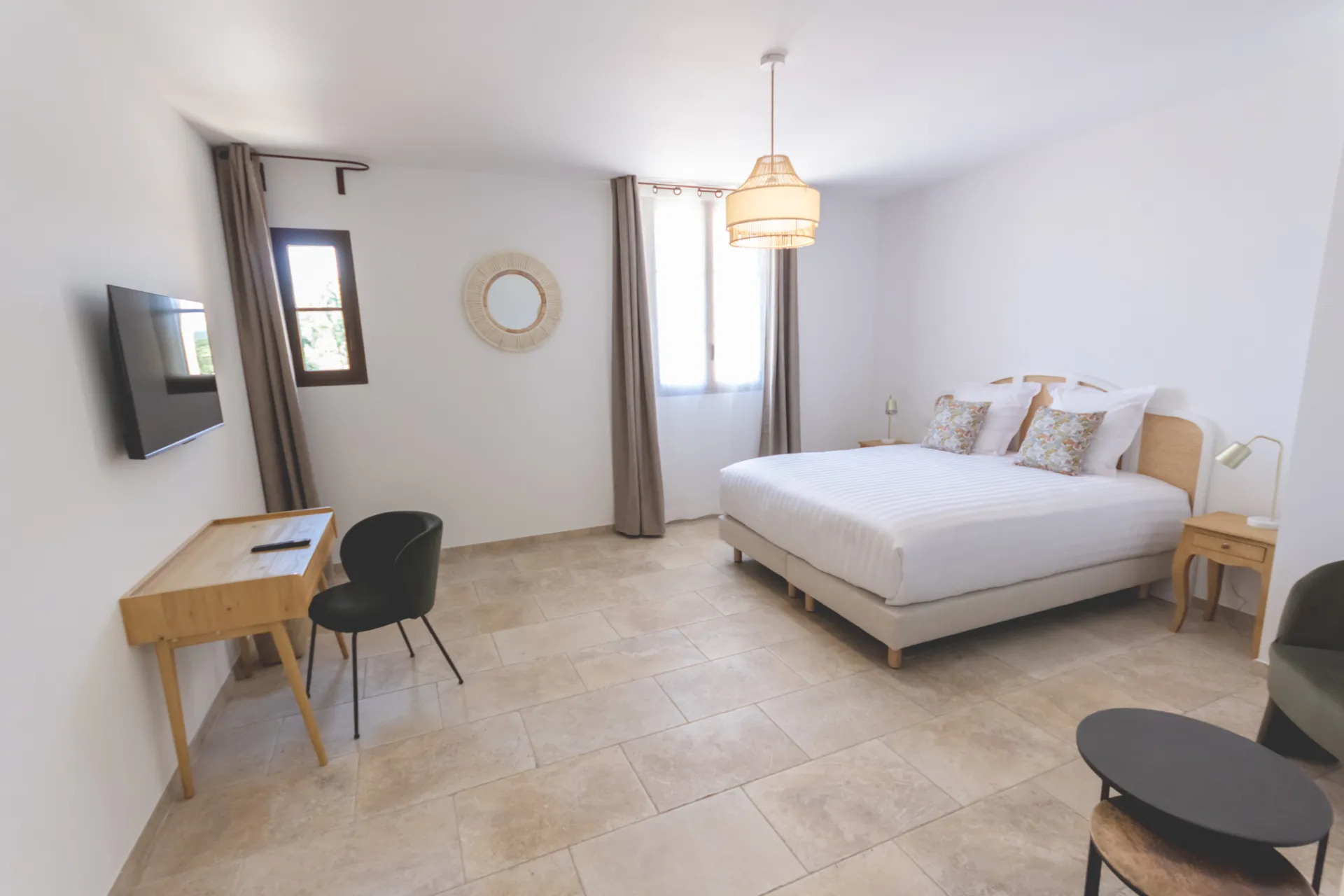 Nos chambres sont toutes climatisées et parfaitement équipées, avec bureau, dressing intégré, machine à café et connexion wifi gratuite, alliant praticité et bien-être. Le petit-déjeuner est proposé en option, et vous pouvez prolonger l’expérience avec notre offre de restauration sur place. Pour des moments de convivialité, un terrain de pétanque est à votre disposition. Enfin, une visite œnotouristique du domaine avec dégustation vous invite à plonger dans l’art de vivre provençal.